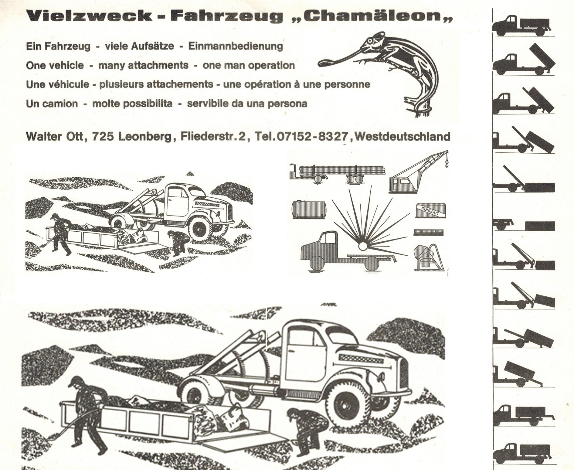 1962 Eintritt der Ehefrau Dagmar Ott in die Firma. Neben dem Tagesgeschäft entwickelt der Firmengründer Walter Ott † das Vielzweckfahrzeug "Chamäleon", um damit die Materialerfassung und den Materialtransport wesentlich zu verbessern.Meilensteine - 04/12/1962
